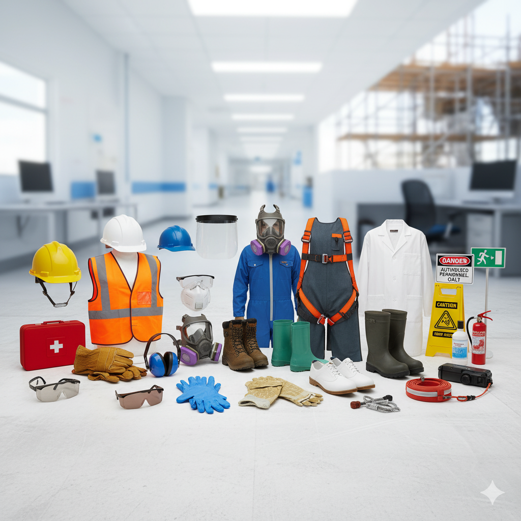 Safety equipment comprises a range of Personal Protective Equipment (PPE) and site safety tools designed to protect workers from hazards in diverse environments (commercial, medical, industrial, construction). These include head, eye, ear, respiratory, hand, foot, and body protection, as well as critical safety signage and emergency gear.